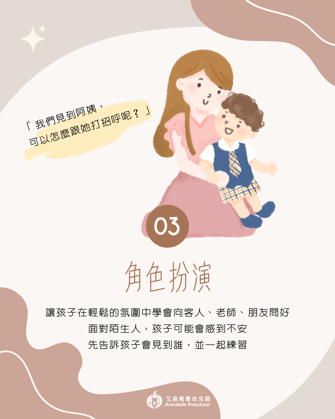 - 讓孩子知道,打招呼可以是微笑或揮手,不一定要說話。