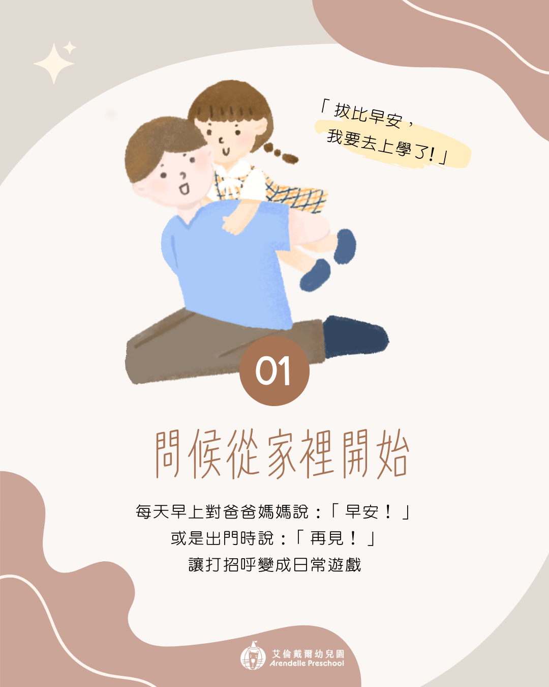 每天早上對爸爸媽媽說:「早安!」,或是離開房間時說:「再見!」,讓打招呼變成日常遊戲。